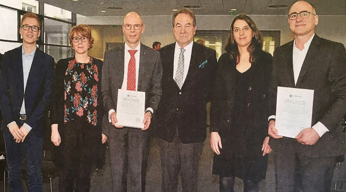 Gefäßchirurg Dr. Gerd Lulay, Mediziner des Mathias-Spitals Rheine, wurde für seine hervorragende medizinische Reputation in den Professorenstand erhoben. Professor Dr. Gerd Lulay (rechts im Bild) ist Mitglied der MDI-Expertengruppe Kompressionstherapie.