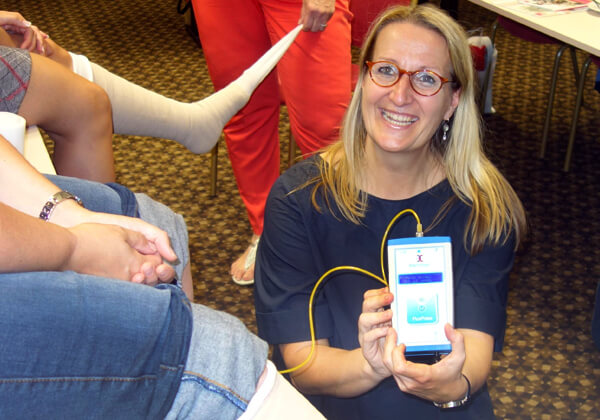 Anschließend hatten die Teilnehmer Gelegenheit, in einem Kompressionsworkshop ihre Fertigkeiten in der praktischen Anlage von Kompressionsbinden zu üben und bestehende Kenntnisse zu vertiefen. Unter sachkundiger Anleitung von Protz legten die Teilnehmer aneinander phlebologische Kompressionsverbände an. Dann ermittelte die Fachexpertin die hierbei erzeugten Druckwerte. Es zeigte sich, wie schwierig es ist, den Druck einzuschätzen, den man bei der Anlage einer solchen Bandagierung erzeugt. Zudem informierten sich die interessierten Teilnehmer über die neuartigen adaptiven Kompressionsbandagen. Unter fachkundiger Anleitung übten sie die Anlage eines solchen Klett- oder Wrap-Verbandes ein, die insgesamt als einfacher und anwenderfreundlicher beurteilt wurde als herkömmliche Kurzzugbindenbandagierungen.
